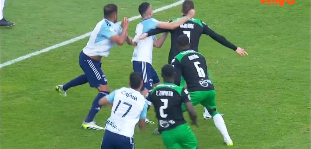 Lejos de calmarse los ánimos, la discusión entre los dos jugadores continuó y hubo un contacto en el que el jugador de Millonarios reflejó un golpe en la cara, pero el juez central no le dio mayor importancia en el momento.