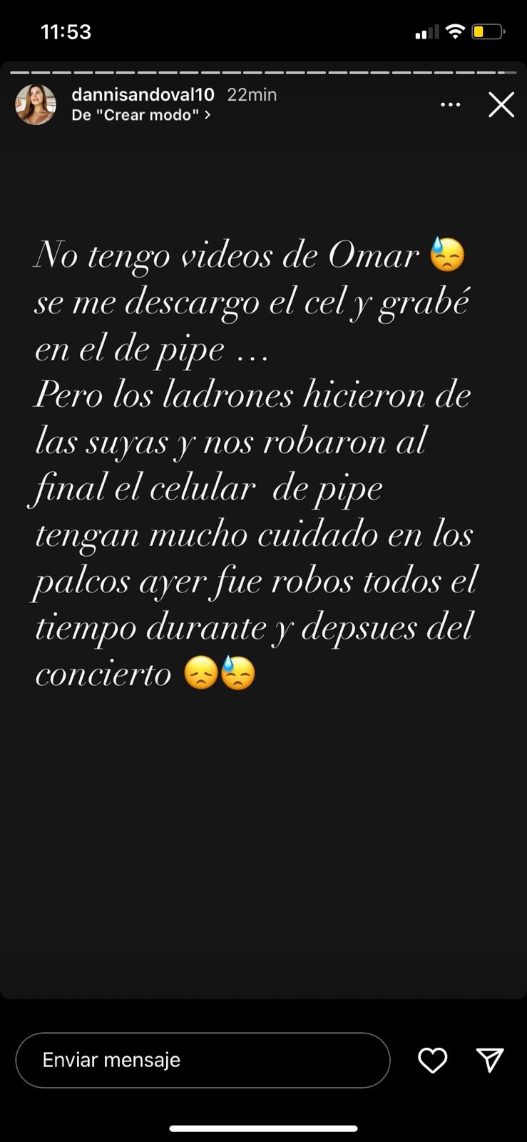 «Los ladrones hicieron de las suyas y nos robaron al final el celular de Pipe. Tengan mucho cuidado, en los palcos ayer fue robos todo el tiempo, durante y después del concierto», compartió.